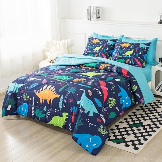 Dinosaur Bedding Full Size for Boys 7 Piece Kids Boy Comforter Full Size 3D Cartoon Blue Jungle Print Bedding Set with Blue Sheets
