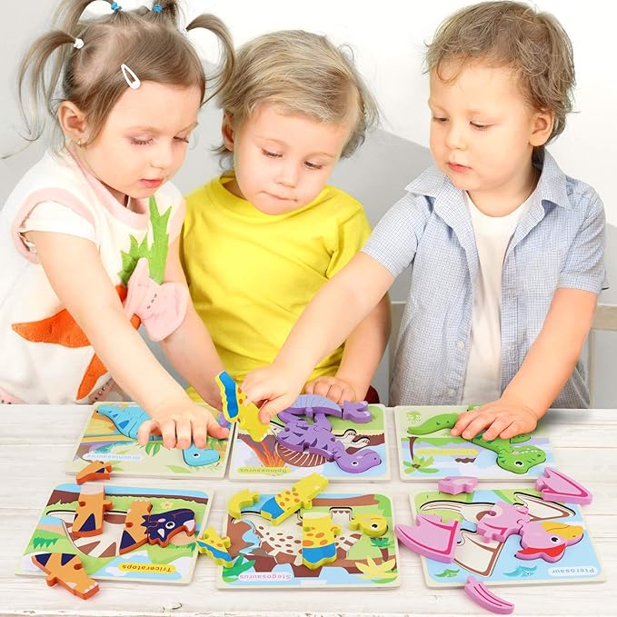 - 【3D Dinosaur Puzzles for Toddlers】The wooden jigsaw puzzles come with 6 cute dinosaurs 3D puzzles(each consist of 5-7 pcs), a drawstring storage bag, and a colored gift box. It's a wonderful gift for toddlers 2-5 years old.